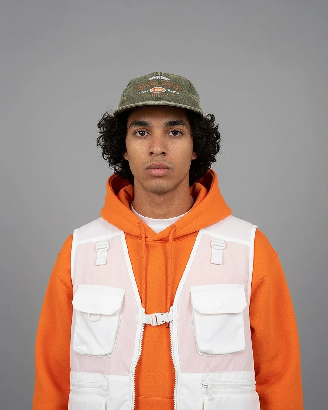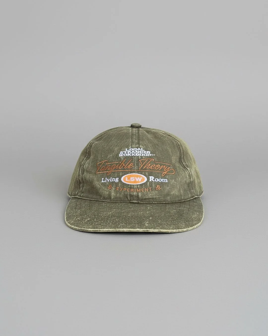A washed-olive canvas cap built straight from the Living Room Experiment ethos — worn, tactile, and made for creators who work with their hands. Featuring layered neon orange LSW embroidery, gold Tangible Theory with workshop heritage. Soft, broken-in, and ready for whatever you’re building next.